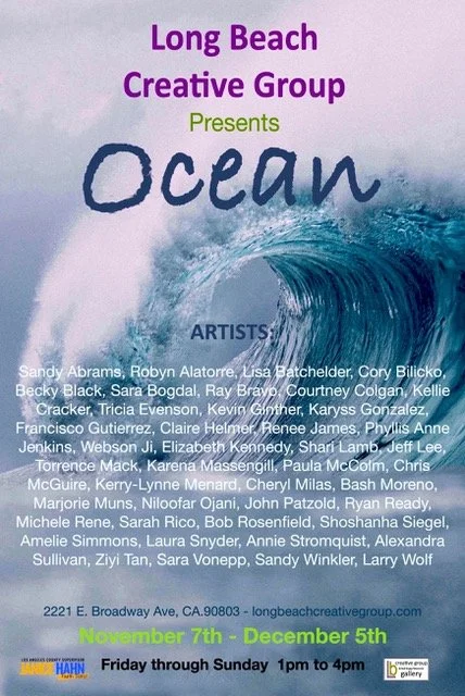 The Long Beach Creative Group presents OCEAN, a group show opening on Sunday, November 7, and running through December 5. The exhibition features 56 pieces by 44 artists, selected by a jury of three art professionals, from nearly 200 submissions. OCEAN is being presented in the LBCG/Rod Briggs Gallery, located at 2221 E Broadway, in Long Beach. The gallery is open Fridays through Sundays from 1-4pm.